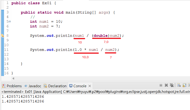 System.out.println(num1 / (double)num2);