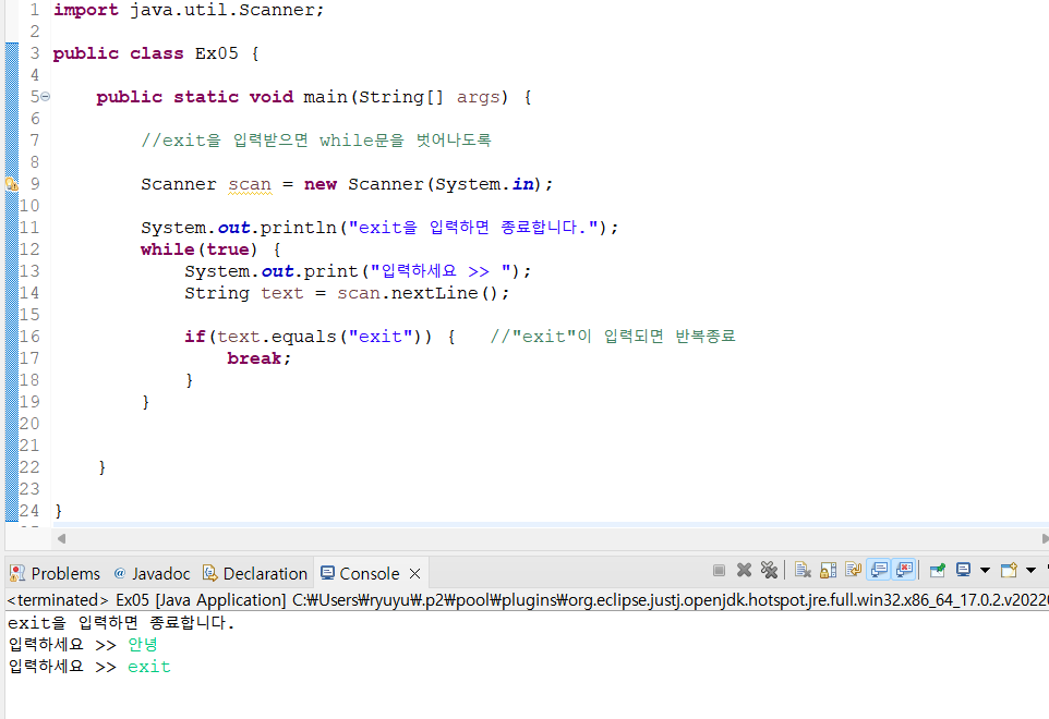 if(text.equals("exit")) { //"exit"이 입력되면 반복종료