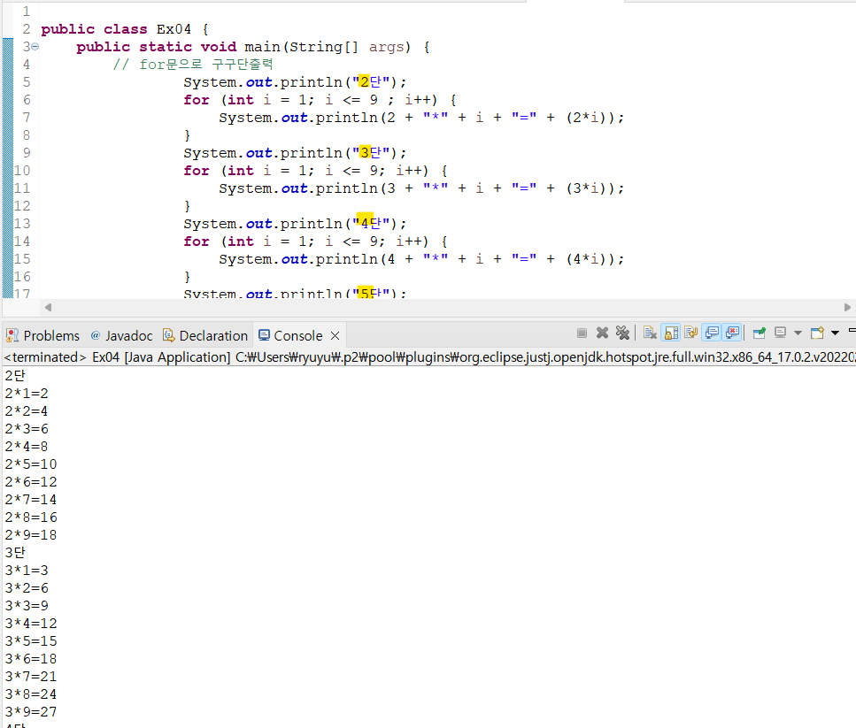 - 위의 for문을 활용한 구구단 출력을 살펴보면 2~9단까지 숫자가 1씩 증가하고, 2단일 때 1~9가 반복되는 것을 알 수 있다.