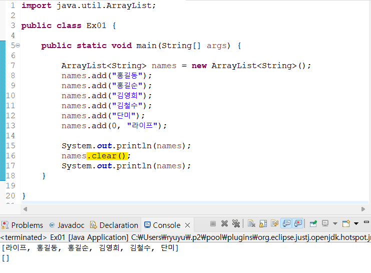 - ArrayList에 있는 모든 요소를 삭제하려면 clear()를 호출한다.