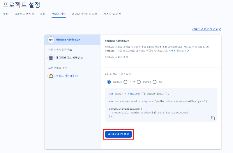 - 프로젝트 설정 → 서비스 계정 → 자바 선택 → ‘새 비공개 키 생성’ 버튼을 누릅니다.