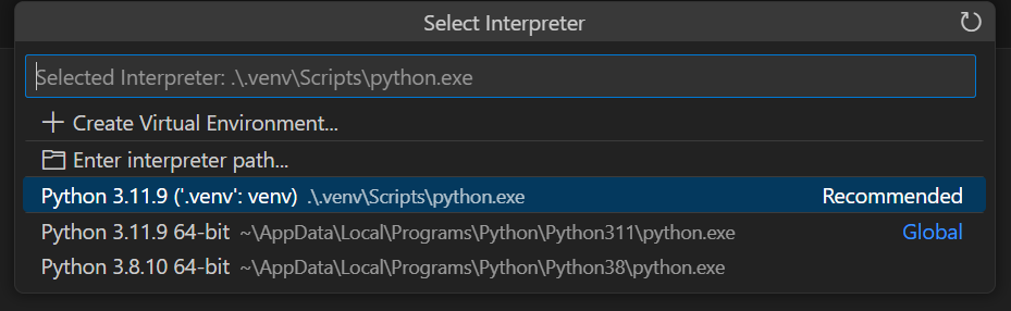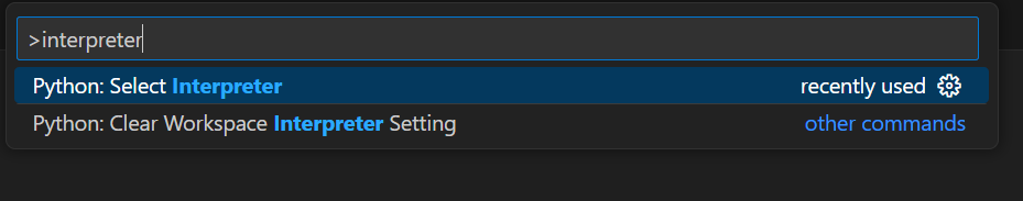 - Ctrl + Shift + p 입력 > Python: Select Interpreter 선택 > 가상환경 선택