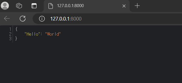 - 브라우저를 열고 http://127.0.0.1:8000으로 이동하면 {"Hello": "World"}라는 JSON 응답을 확인할 수 있습니다.