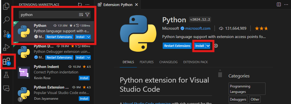 - 검색창에 "Python"을 입력하고, "Python" 확장 프로그램을 설치