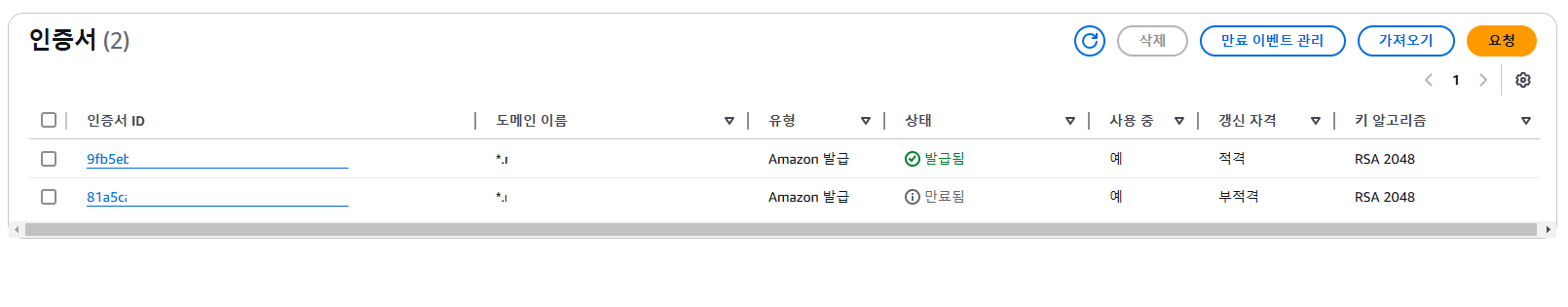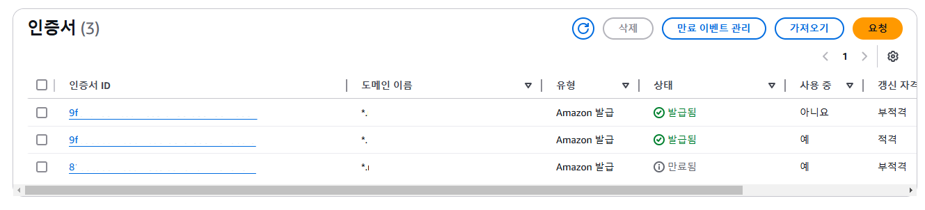 AWS Certificate Manager(ACM)에 로그인하여 만료된 인증서를 확인하고 요청을 진행했습니다.