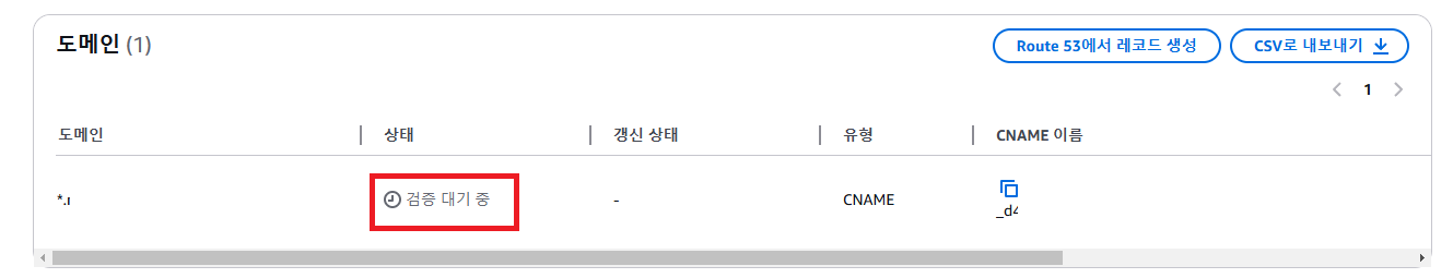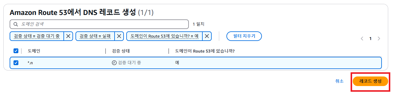 인증서 상세 페이지에서 AWS Route 53의 "레코드 생성" 버튼을 눌러 레코드를 추가하고, 레코드 생성 과정을 거치니 곧바로 검증이 완료되었어요.