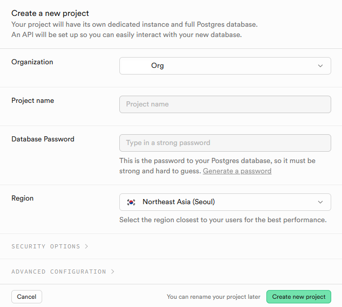 - 조직(Organization), 프로젝트 이름, 데이터베이스 비밀번호, 리전(Region)을 입력합니다.