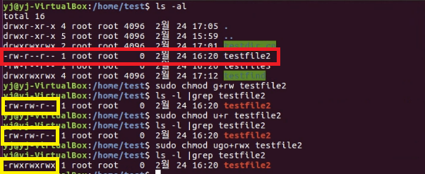 chmod g+rw testfile2 //해당 그룹에 속하는 유저에게 읽기/쓰기 권한 부여