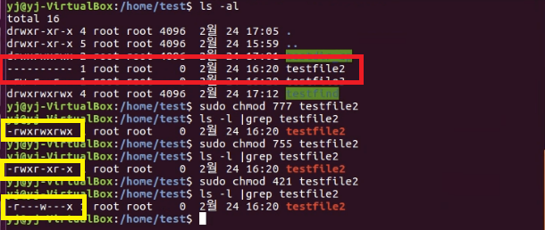 chmod 421 testfile2 //사용자 :읽기 권한 , 그룹 : 쓰기 권한, 모든유저: 실행 권한