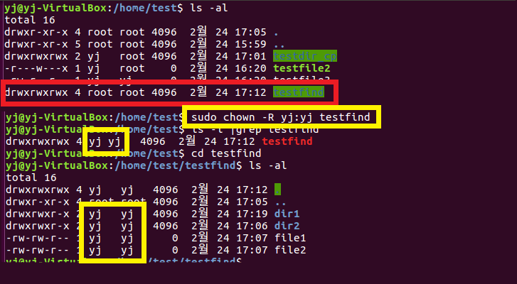 chown -R yj:yj testfind