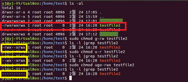 chmod ugo-rwx testfile2 //소유자, 그룹, 모든 유저에게 읽기/쓰기/실행 권한 삭제