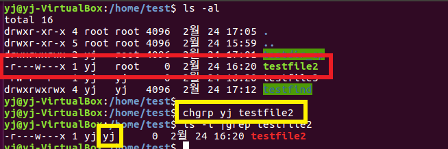 chgrp yj testfile2